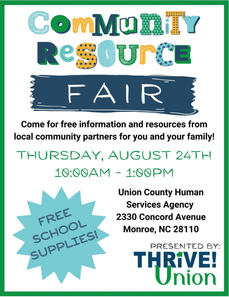 Thrive! Union is hosting a Community Resource Fair on Thursday, August 24th, 2023, from 10 a.m. to 1 p.m. at the Union County Human Services Agency, 2330 Concord Avenue, Monroe, NC 28110.